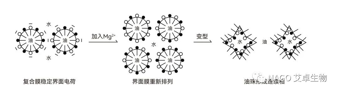 分散相的微球狀液滴直徑一般在0.05~10μm之間時,微小液球會相互聚集,力圖縮小界面積,降低界面能,分散的微小液球逐漸合并,液滴逐漸變大,最后使油和水重新分開成為兩層液體,油和水又恢復到原來狀態(tài)。如圖1