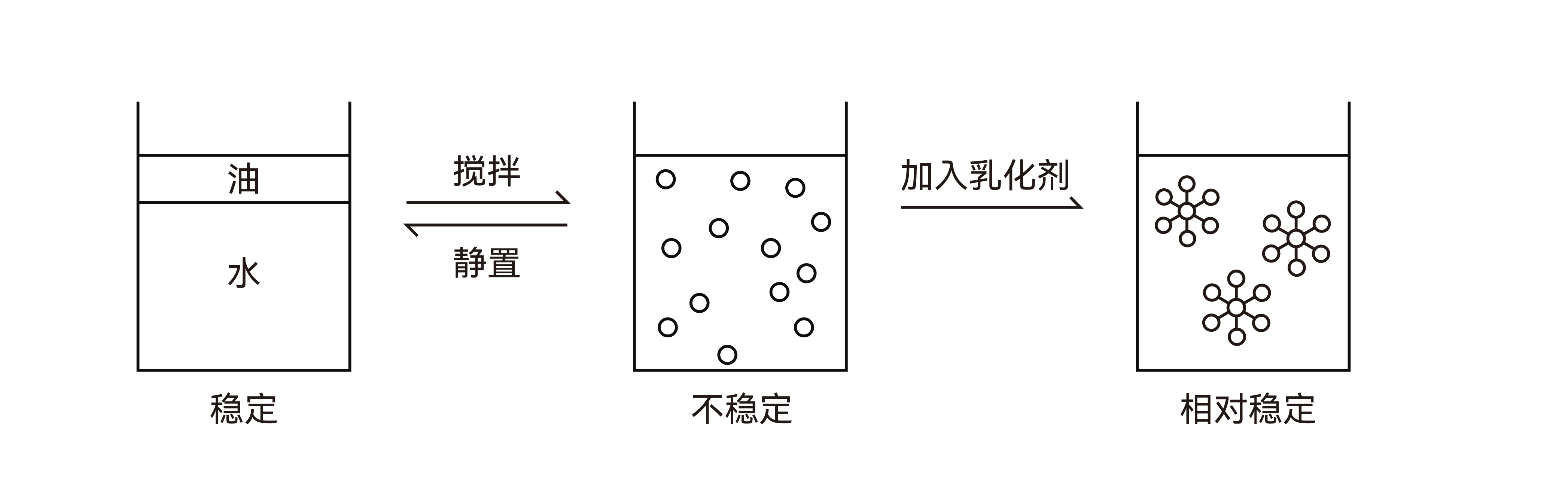 分層、變型和破乳。分層是由于分散相和分散介質(zhì)密度不同,出現(xiàn)分散微粒上升和下沉的現(xiàn)象;變型是乳狀液類型突然發(fā)生轉(zhuǎn)變;破乳是乳狀液體系完全破壞,分層與變形可同時發(fā)生。
