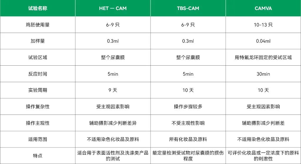 目前使用CAM用于眼刺激測試的方法有三種:雞胚絨毛尿囊膜試驗(Hen’s egg test on the chorioallantoic membrane,HET-CAM),雞胚絨毛尿囊膜血管試驗(Chorioallantoic membrane vascular assay, CAMVA),雞胚尿囊膜臺盼藍染色試驗(the chorioallantoic membrane-trypan blue staining assay, TBS-CAM)。本文將針對以上三種動物替代試驗展開介紹。